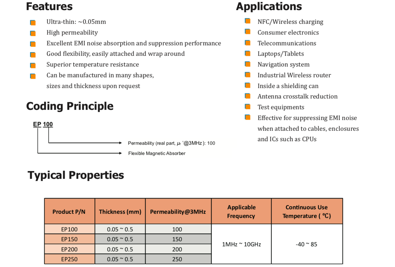TM EP系列柔性磁吸收材料設(shè)計用于抑制電子設(shè)備產(chǎn)生的有害電磁波和高頻噪聲。本產(chǎn)品還可用于保護產(chǎn)品免受外部噪音的影響,從而減少由相鄰電子產(chǎn)品的電磁波引起的故障和干擾。" />