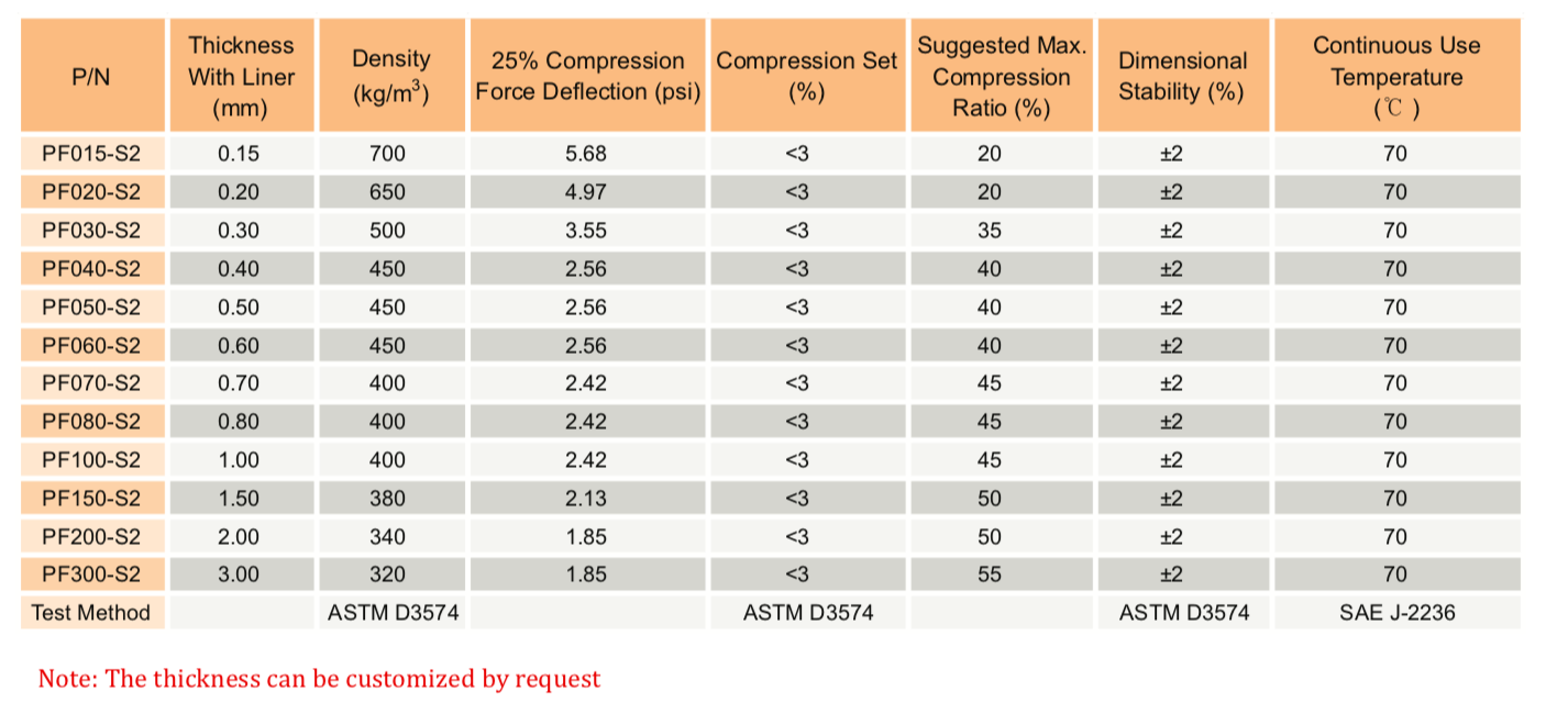 TM PF-S2 系列是一種柔軟、緩慢回彈的泡棉,用于電子設備應用中的緩沖、保護性密封和長期間隙填充。S2系列泡棉具有極低的壓縮永久變形、高密封性能和優異的沖擊吸收性能。" />