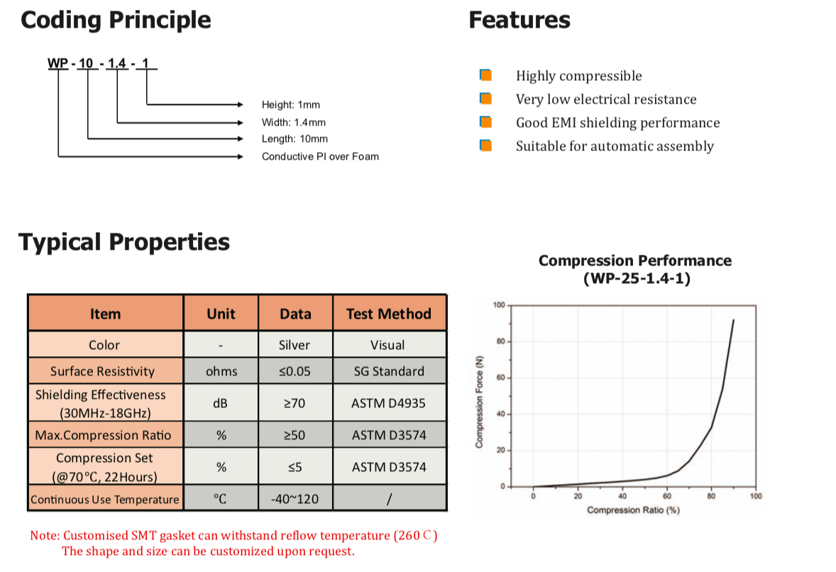 ShielditeTMWP系列導電PI覆蓋泡棉材料由高導電Cu/Ni鍍層PI以及PU泡棉芯和導電壓敏丙烯酸粘合劑組成。這些材料具有極高的可壓縮性,專門設計用于提供卓越的EMI屏蔽和接地性能,并提供防塵和防潮保護。WP系列產品因其容易調整尺寸,適用于計算機、智能手機、LCD/TV和電信制造行業的固定墊圈應用,可根據要求定制回流焊墊片。