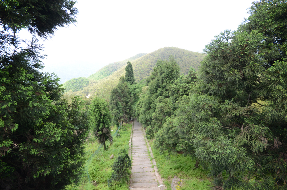 黑麋峰主峰590.5米,通向山頂?shù)牡朗且粭l蜿蜒曲折的石階,山陡之處接近45°。對(duì)于年輕的小伙子們來(lái)說(shuō),可應(yīng)付自如,可對(duì)于均年齡在50歲左右的阿姨們來(lái)說(shuō),卻是不小的難度。