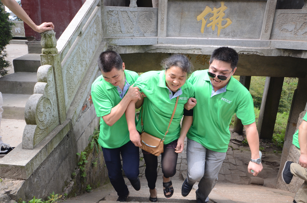 終于,在通向山頂?shù)淖詈?00米處,阿姨們不堪重負(fù),有心通山頂卻無(wú)力前行。這時(shí)候,家湘美的小伙子們將團(tuán)隊(duì)不拋棄不放棄的精神及時(shí)體現(xiàn)了出來(lái)。兩兩協(xié)作扶著、撐著甚至是架著阿姨前行。原本可輕松奪冠的“快樂隊(duì)”隊(duì)長(zhǎng),放棄了提前到達(dá)山頂?shù)臋C(jī)會(huì),主動(dòng)停下來(lái)協(xié)助阿姨登頂。